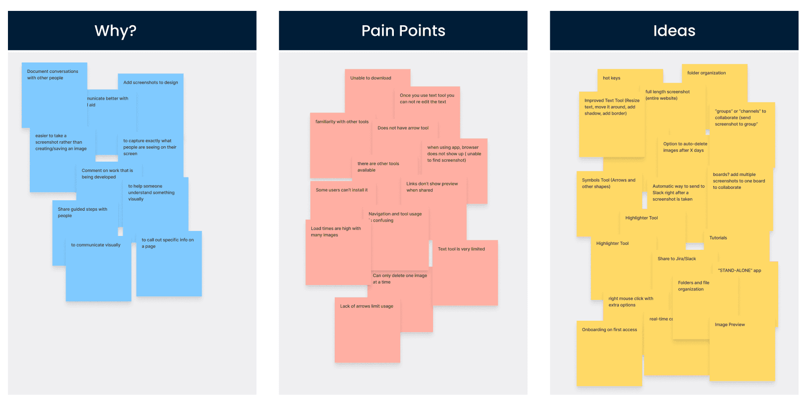 After the interviews, it was time to dissect our findings. I set up a few card sorting sessions with my PM to clearly organize our findings and help us map out the path to designing.