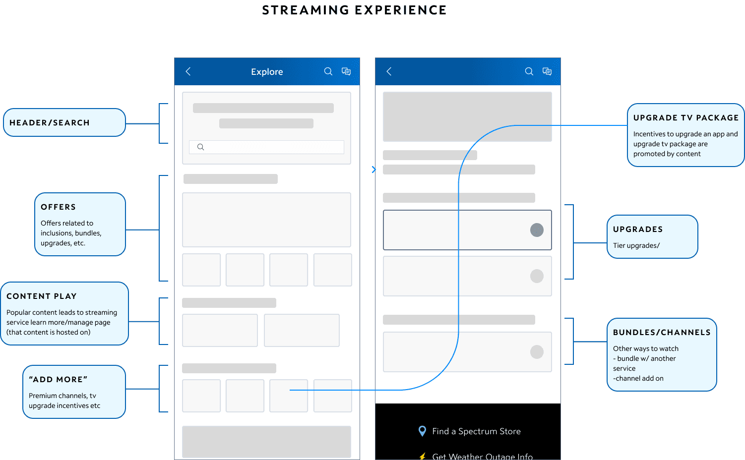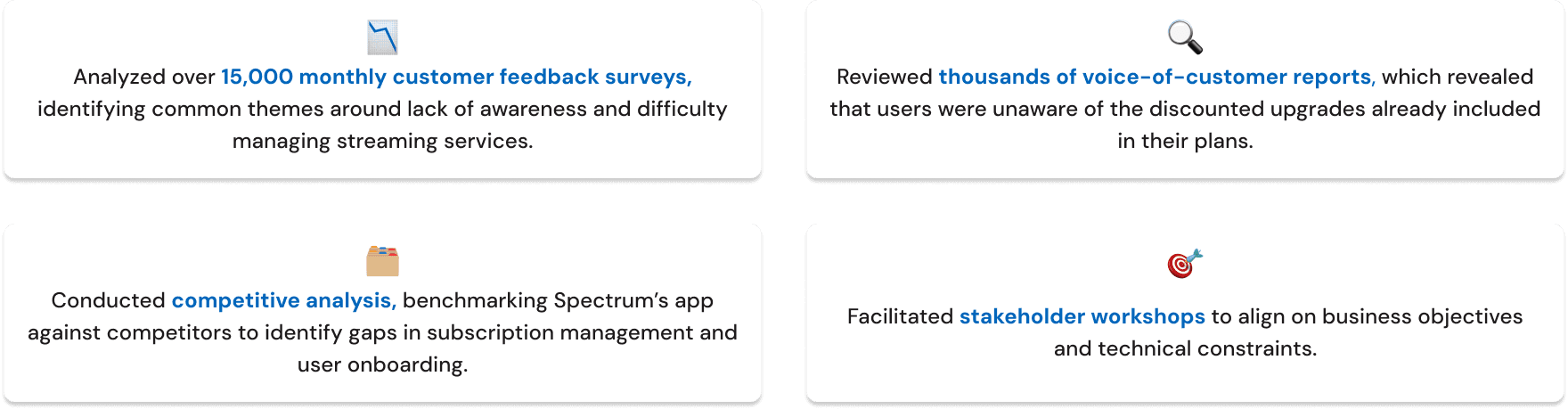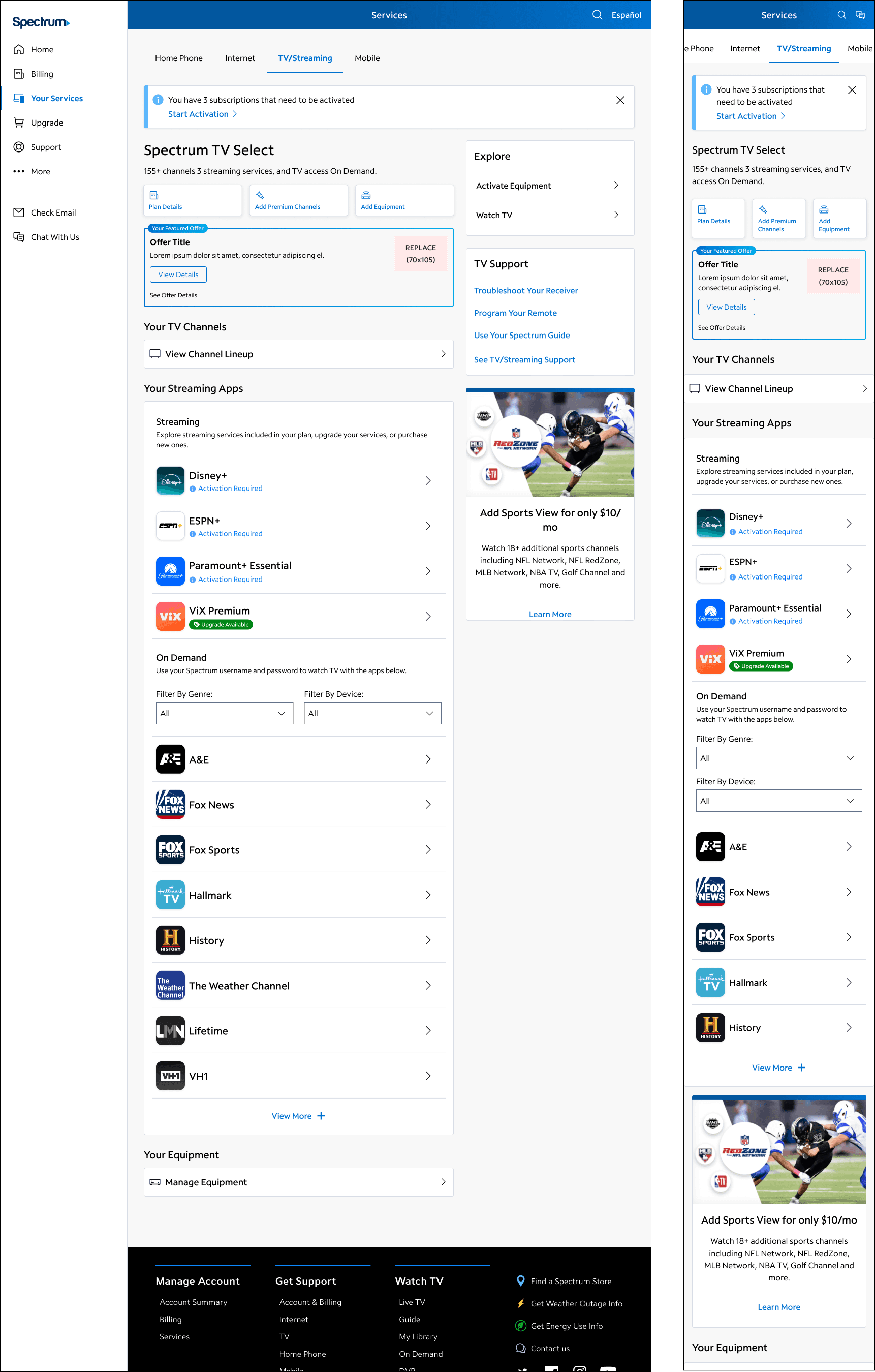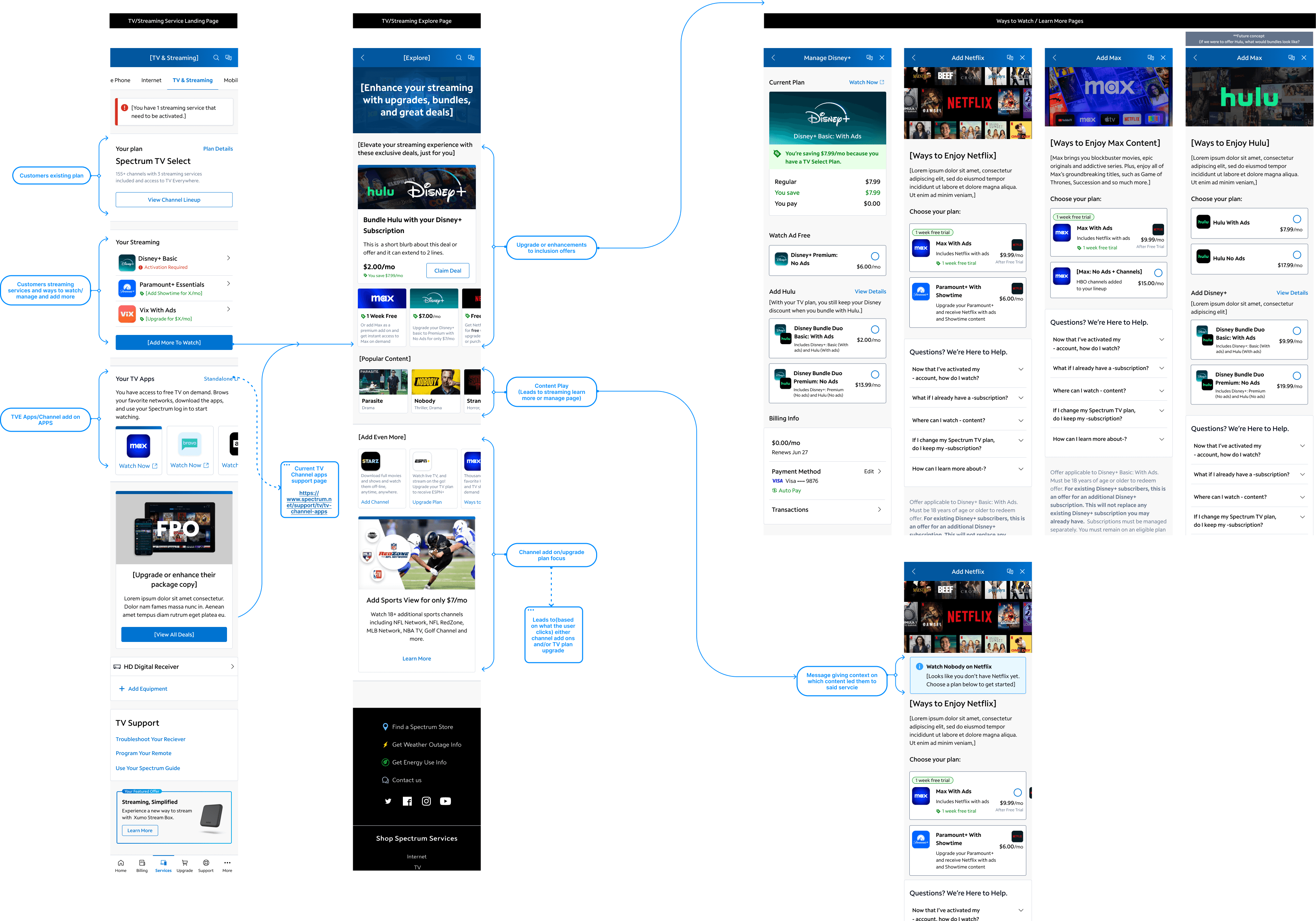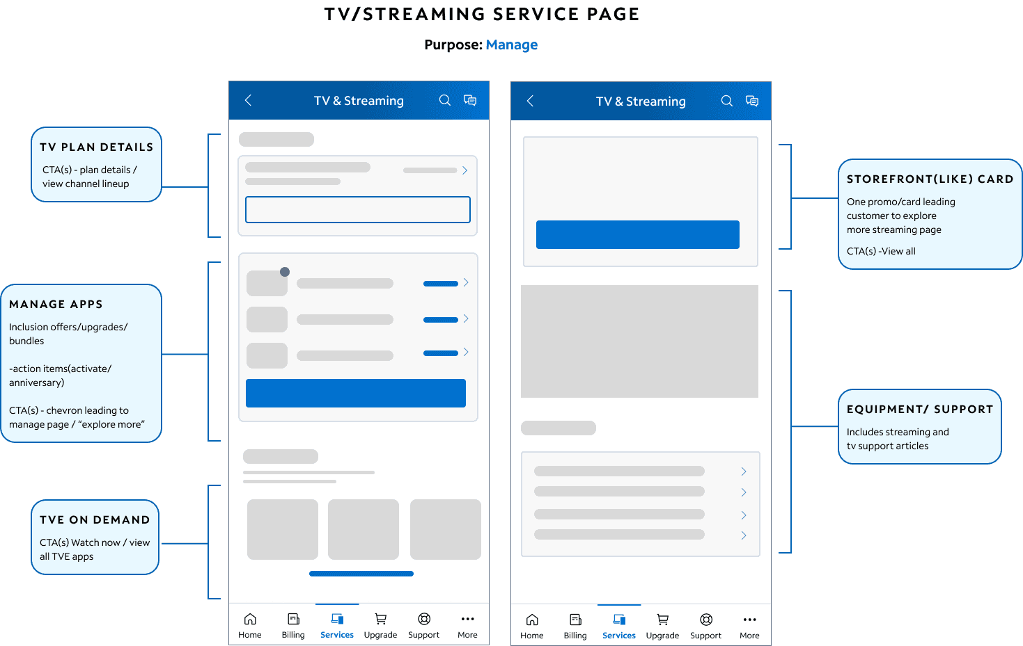 Previously, customers could only access their streaming services through the plan details page, which provided limited context and little guidance on how to manage subscriptions or upgrade and downgrade services. A la carte streaming options were also not clearly surfaced. This created a significant opportunity to reimagine the TV landing page—transforming it into a more intuitive, discovery-driven experience that supports key use cases such as managing existing services and exploring new TV and streaming apps.