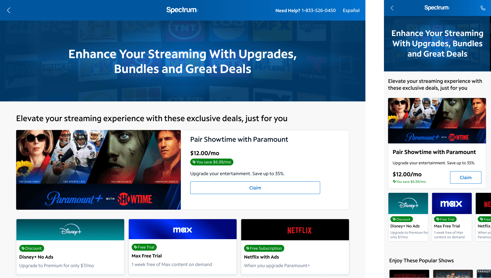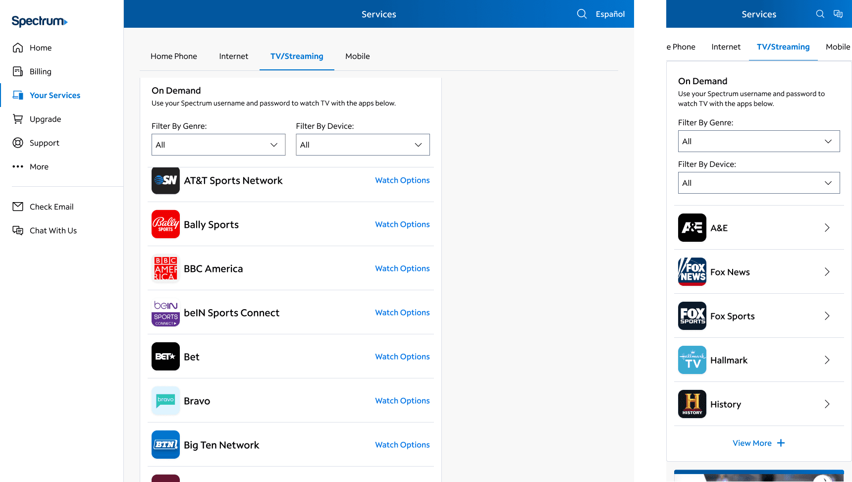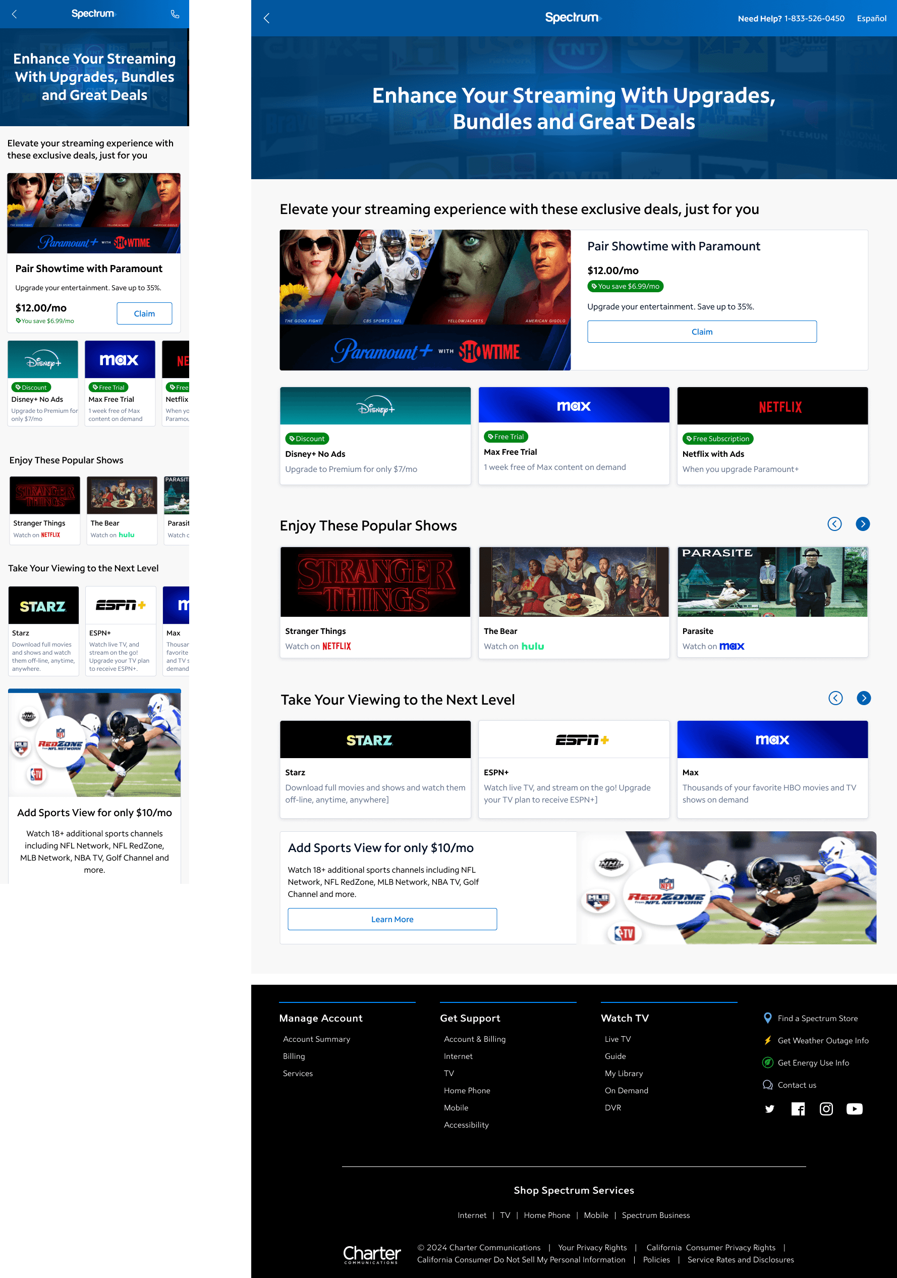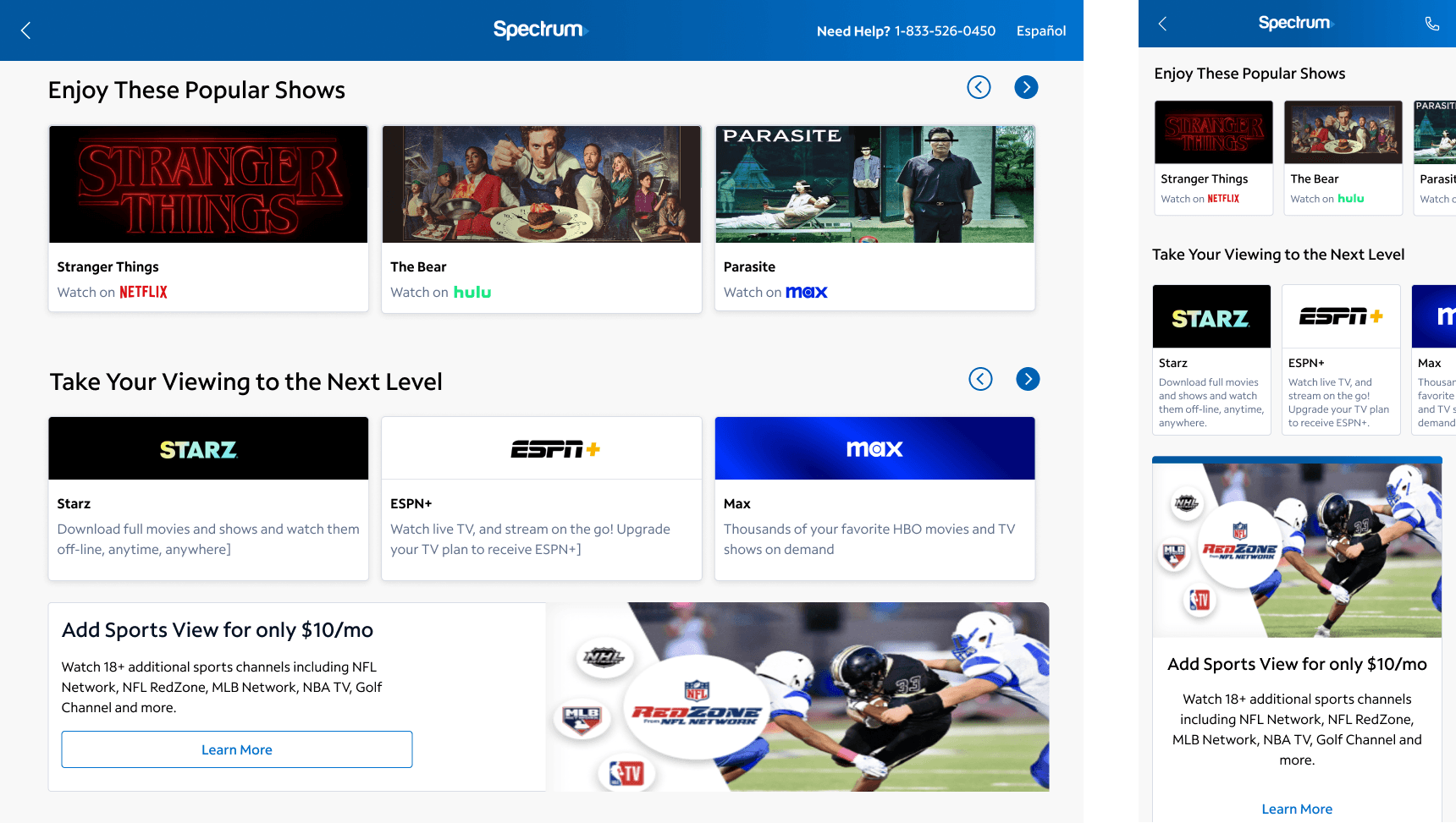 Previously, customers could only access their streaming services through the plan details page, which provided limited context and little guidance on how to manage subscriptions or upgrade and downgrade services. A la carte streaming options were also not clearly surfaced. This created a significant opportunity to reimagine the TV landing page—transforming it into a more intuitive, discovery-driven experience that supports key use cases such as managing existing services and exploring new TV and streaming apps.