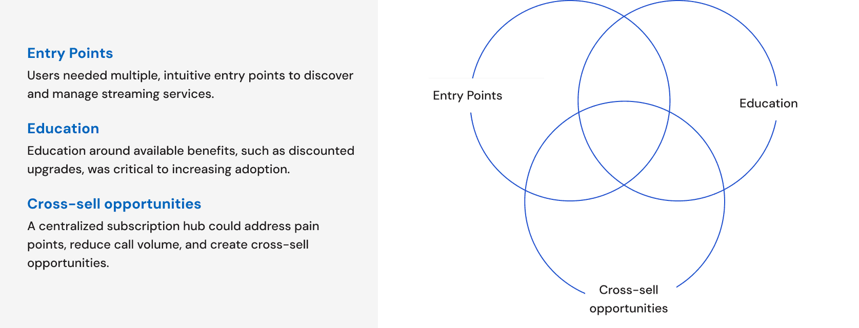 With over 36 monthly customer feedback surveys, 47% of the streaming feedback was related to lack of awareness. Not only did customers not know about these perks, there was no way for them to learn about them, activate their apps, or manage them without calling a customer rep.